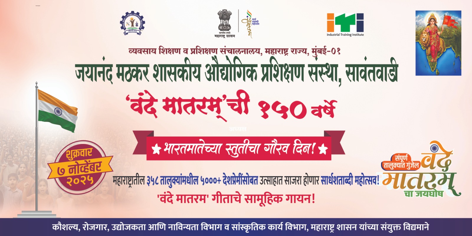'वंदे मातरम' ची 150 वर्षे, सार्धशताब्दी' सोहळा 'वंदे मातरम' ची 150 वर्षे, सार्धशताब्दी' सोहळा - भारतमातेच्या स्तुतीचा गौरव दिन (दिनांक: ०७ नोव्हेंबर, २०२५) जयानंद मठकर शासकीय औद्योगिक प्रशिक्षण संस्था, सावंतवाडी. वंदे मातरम या राष्ट्रगीताच्या १५० वर्षांच्या गौरवशाली पूर्तीनिमित्त, 'वंदे मातरम सार्धशताब्दी' महोत्सवाचे आयोजन करण्यात आले होते. भारतमातेच्या स्तुतीचा गौरव दिन म्हणून साजरा झालेला हा सोहळा जयानंद मठकर शासकीय औद्योगिक प्रशिक्षण संस्था, यांच्यावतीने राणी पार्वतीदेवी हायस्कूल व ज्युनियर कॉलेज, सावंतवाडी यांच्या पातान्गानामध्ये मोठ्या उत्साहात व सुंदर वातावरणात संपन्न झाला. या वेळी वंदे मातरम गीताचे सामूहिक गायन करण्यात आले. सदर कार्यक्रमासाठी सुमारे १६५० विध्यार्थी, शिक्षक वर्ग, पालकवर्ग, प्रतिष्ठीत नागरिक, विविध क्षेत्रातील सन्माननीय ......Read More